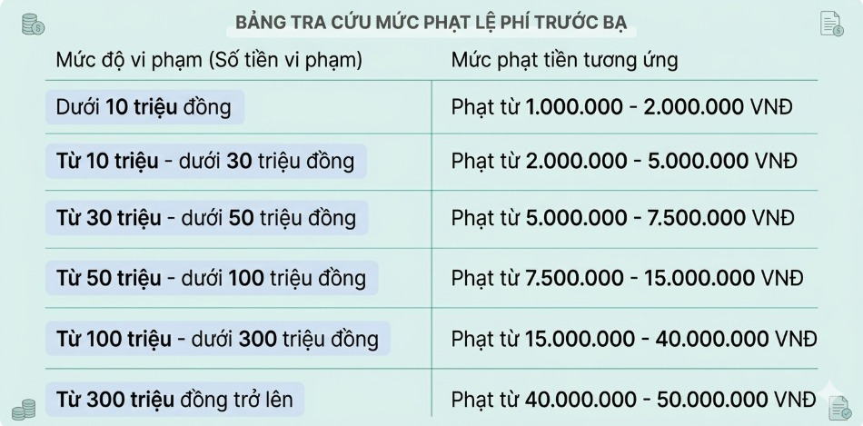 Hiện nay, theo Điều 17 Nghị định 02/2026/NĐ-CP, người nộp phí, lệ phí bị phạt cảnh cáo nếu vi phạm nghĩa vụ nộp phí, lệ phí không kịp thời nhưng không dẫn đến thiếu số tiền phí, lệ phí phải nộp. Trường hợp nộp phí, lệ phí không kịp thời dẫn đến thiếu số tiền phí, lệ phí phải nộp thì bị phạt tiền tùy theo mức độ vi phạm.