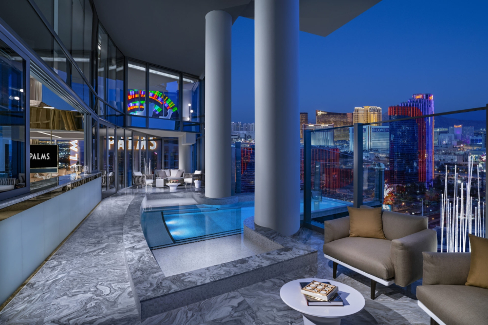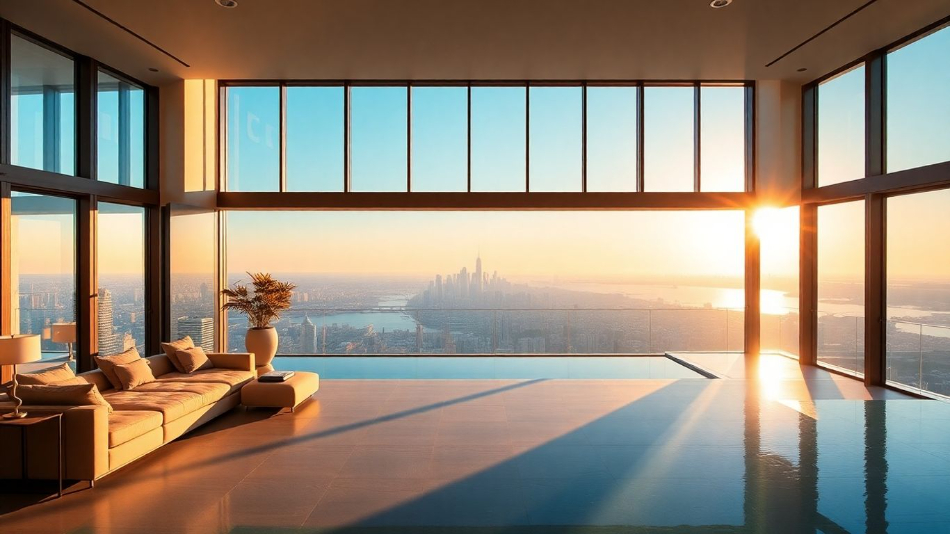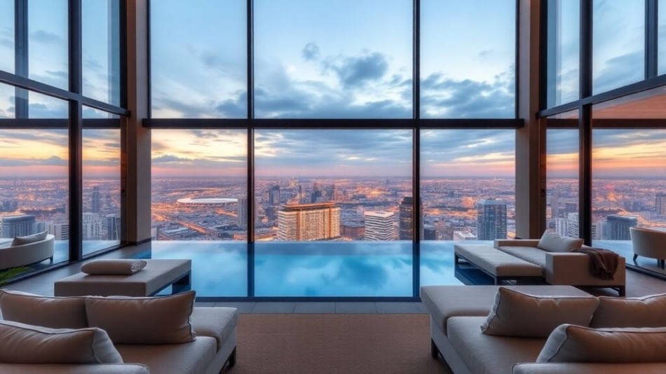 Nội thất Sky Villa với trần cao gấp đôi và kính lớn nhìn toàn cảnh thành phố